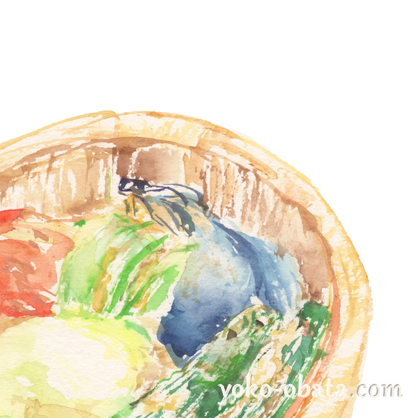 野菜は本当はもっと渋い色をしているけれど、イラストにするときは新鮮さも感じられるよう少し鮮やかさを感じる色合いにしています。